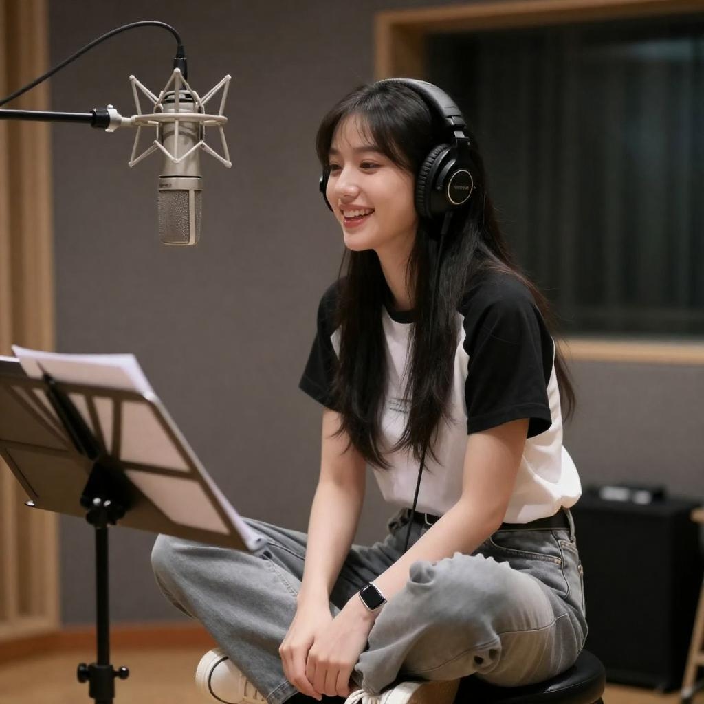 Young woman with long black hair, wearing a black and white T-shirt, gray pants, and large black headphones, sitting cross-legged on a stool in a recording studio. She smiles with an open mouth. Microphone on stand to her left, music stand with sheet music in front of her. Dark acoustic panels in the background.