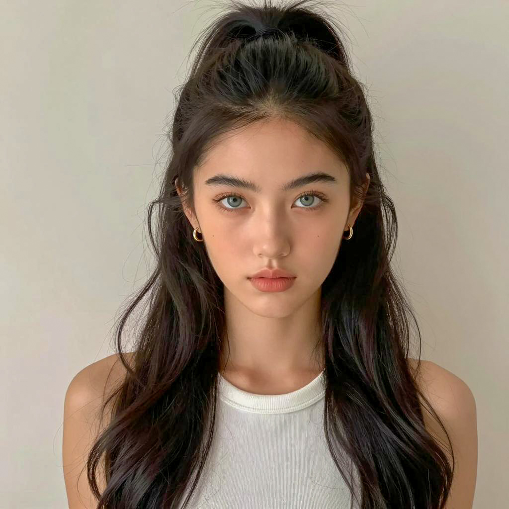 Photograph of a woman with fair skin, green eyes, and dark brown hair in a high bun. She has thick eyebrows, long eyelashes, and wears dark red lipstick. She is resting her chin on her hand with a slightly open mouth. She wears a green knitted sweater. The background is a blurred light green wall.