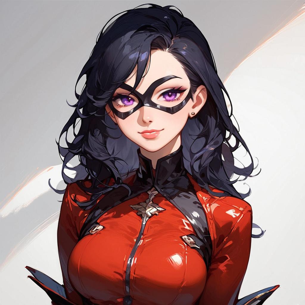 Score_9, score_8_up, score_7_up, score_6_up, score_5_up, score_4_up, , source_anime, 1girl, violetparr, black hair, long hair, purple eyes, domino mask, red bodysuit, upper body, smile, standing, looking at viewer, marker \(medium\)