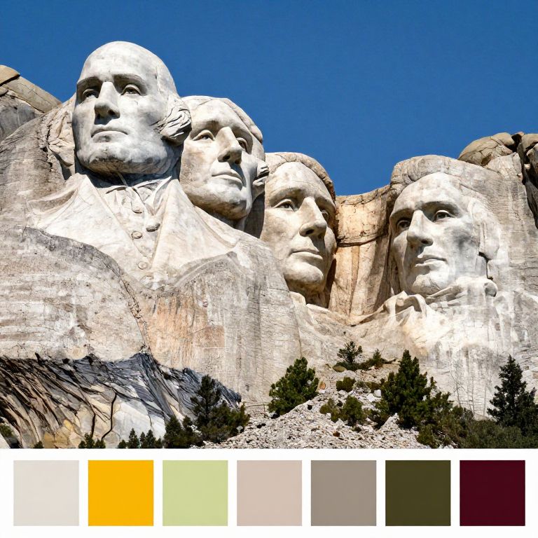 Photograph of Mount Rushmore featuring four large, white-carved presidential faces against a clear blue sky, with color palette below.