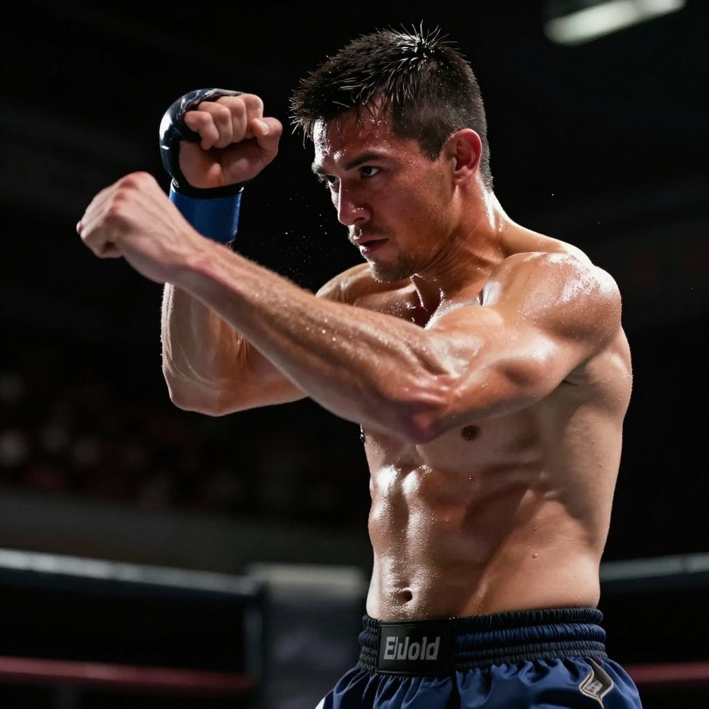 Photograph of a muscular, shirtless male boxer with short black hair, sweating, punching his left arm in a dimly lit boxing ring. He