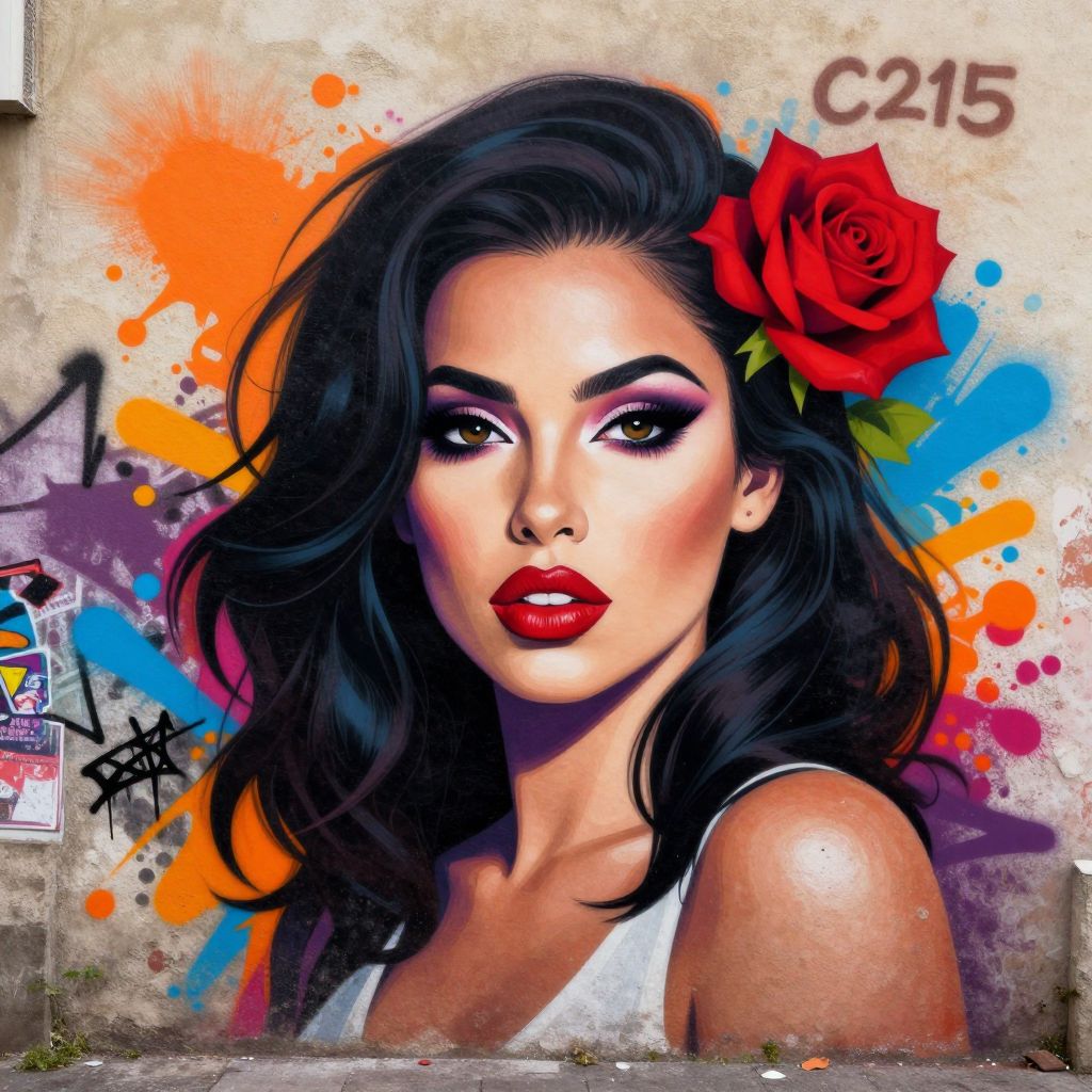 A vibrant digital illustration inspired by street art, featuring a woman with bold makeup and a red rose in her hair, set against a graffiti-style background with splashes of orange and blue, reminiscent of the urban aesthetic of C215 in Fontenay-aux-Roses, France.