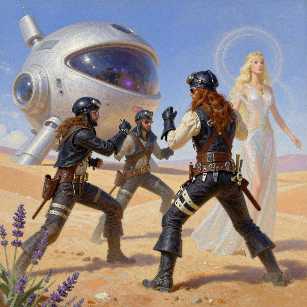 Honey Lavender retro fantasy painting of futuristic space pirates fighting for an ethereal woman in the desert, highly detailed,