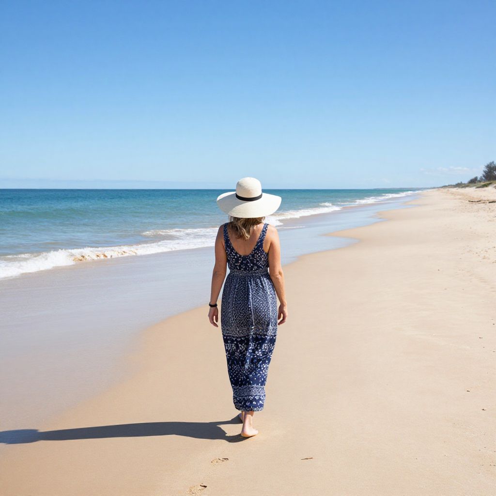 Woman strolling along West Australia's Broome Cable Beach, wearing a wide-brimmed hat and a navy-blue patterned dress, with the azure ocean and clear sky stretching endlessly behind her.