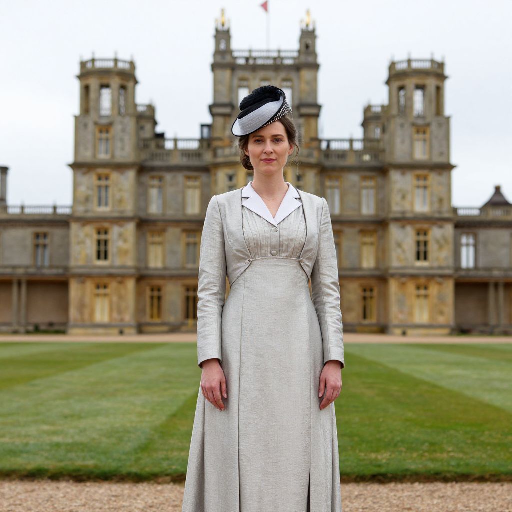Downton abbey costume season, woman in a dress and hat standing in front of a building
