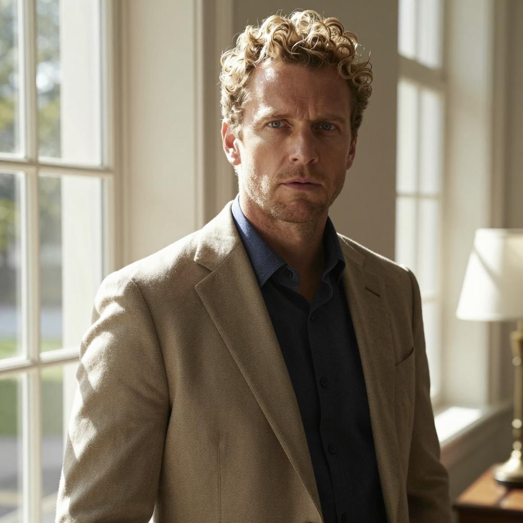Portrait of a light brown-haired man wearing a black shirt and leather jacket, holding a large wooden acoustic guitar over his shoulder. The background shows a foggy stadium illuminated with warm orange lights and strings of round lights creating a moody atmosphere. The man has an intense expression, standing near a railing on the field.