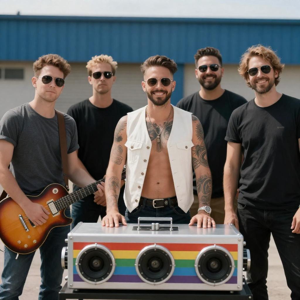 Photograph of six men outdoors, five standing behind a silver, rainbow-colored, multi-camera contraption. Shirtless man with tattoos in center, white vest, smiling. Guitarist on left, sunglasses man on right, smiling. Blue industrial building background. Bright sunlight. Casual clothing.