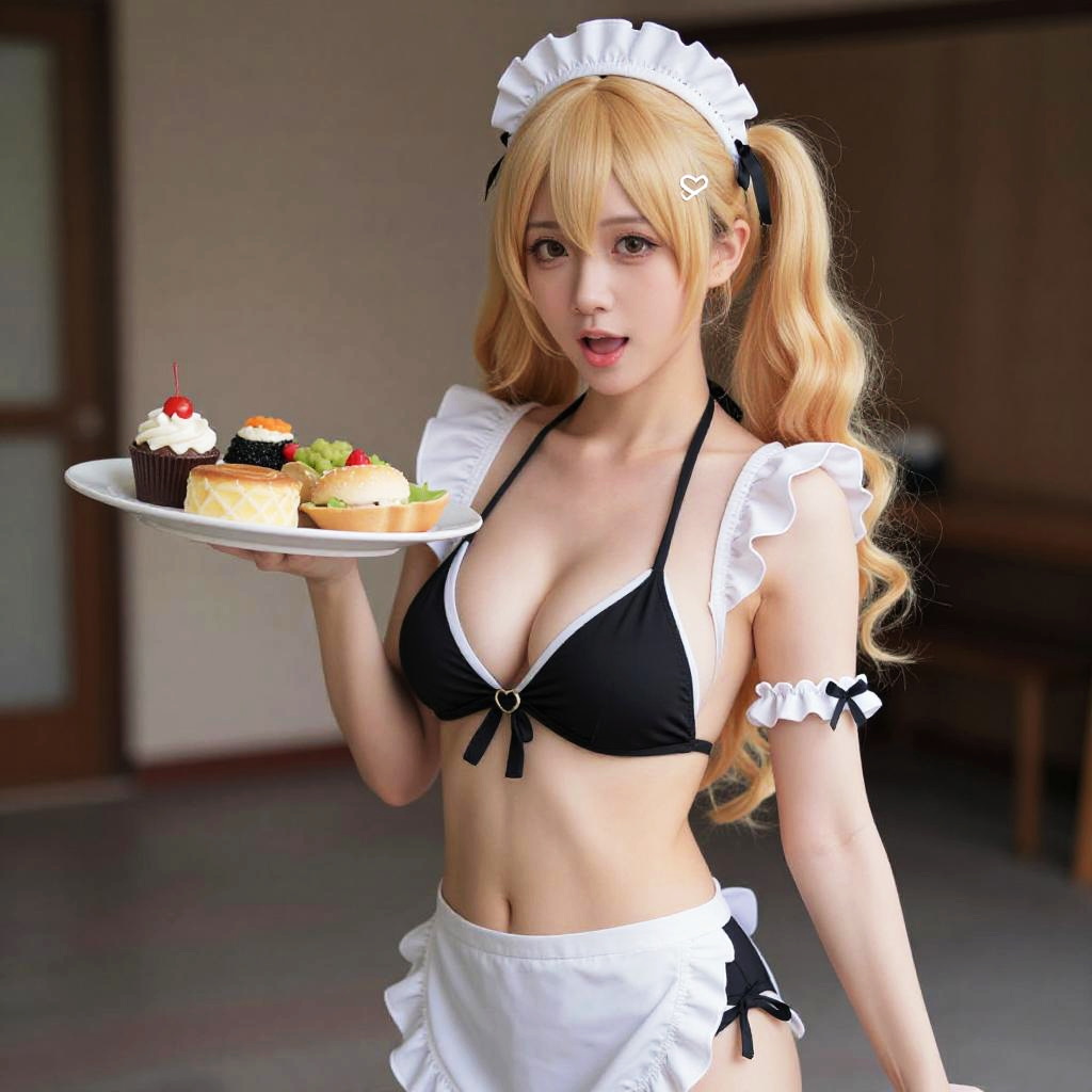 Ultra realistic 8k cg, picture-perfect face, flawless, clean, best quality, masterpiece, (photorealistic:1.4), (1girl:1.5), carrying delicious foodstanding, fair skin, soft light, blonde hair, maid bikini, wavy hair, maid headdress, cleavage, carrying delicious food, waist apron, strap pull, swimsuit, orange hair, hair ornament, maid, black bikini, open mouth, long hair, apron, solo, frills, alternate costume, bridal garter, large breasts, hairclip, breasts, heart, brown eyes, bikini, high ponytail, looking at viewer, cowboy shot