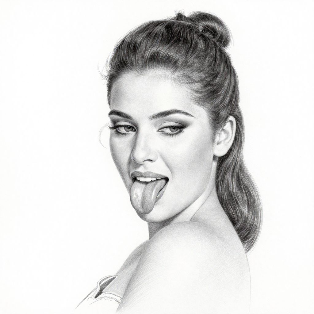 This is a detailed black and white digital drawing of a young woman with light skin, looking over her shoulder and sticking out her tongue playfully. She has long, dark, wavy hair tied up in a loose bun. Her eyes are slightly squinted, and she has a mischievous expression. The background is plain white, making her the focal point. She is wearing a sleeveless top, and the texture of the drawing mimics pencil or ink shading, adding depth to her hair and facial features. The overall style is realistic with a touch of cartoonish playfulness.