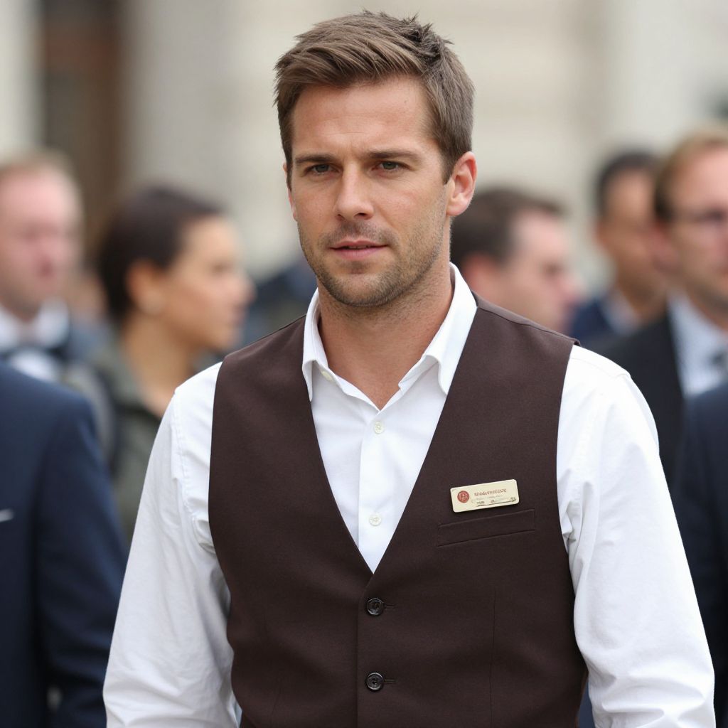Man with short brown hair, wearing a white shirt and a brown vest with a name tag on it. He is standing in a busy area with other people in the background.