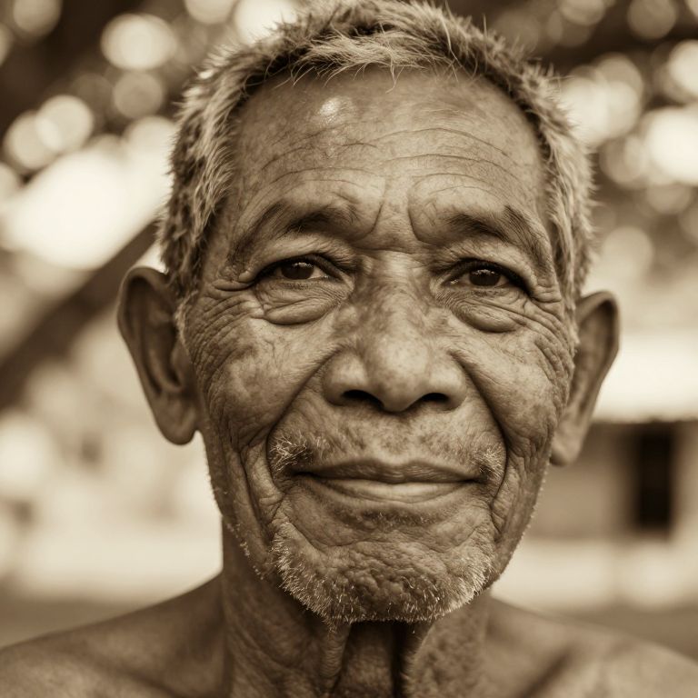 Craft a vintage sepia-toned photograph focusing on an elderly Melanesian man's close-up portrait, showcasing his wrinkled skin and kind smile. Capture this from a unique 'bug's-eye view' perspective, highlighting the intricate warmth of his eyes and expressive wrinkles. Soft golden sunlight filters through nearby tree branches, illuminating his face with gentle shadows across his cheeks, evoking a sense of wisdom, resilience, and quiet strength in a nostalgic atmosphere.