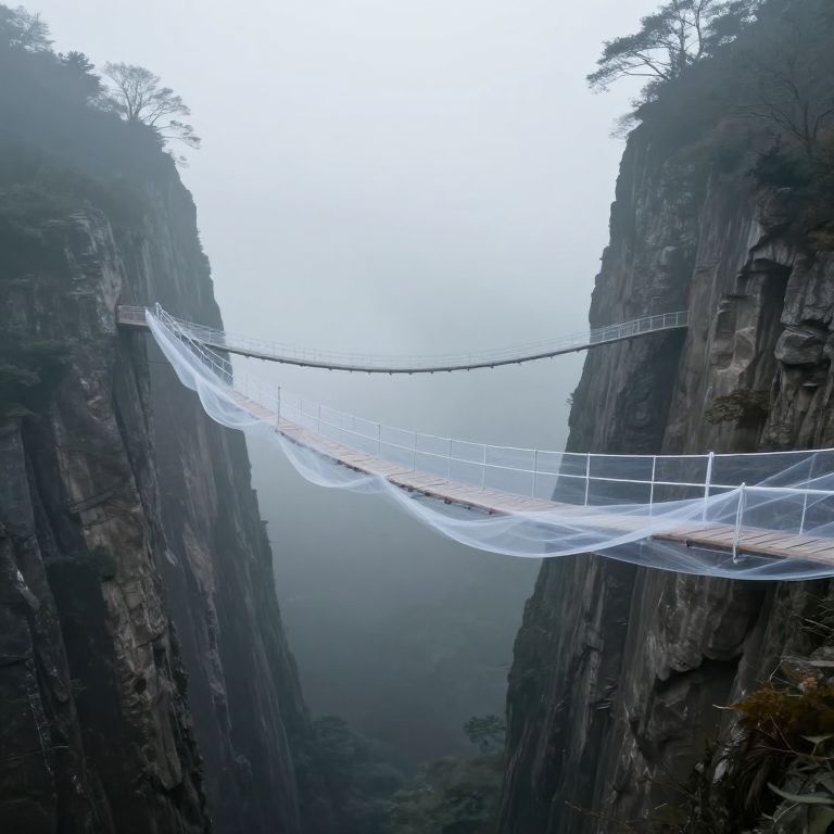 A delicate, ethereal bridge of flowing, translucent strands spans an impossibly vast chasm between two silent cliffs, defying gravity and reason as it weaves through the misty void below.