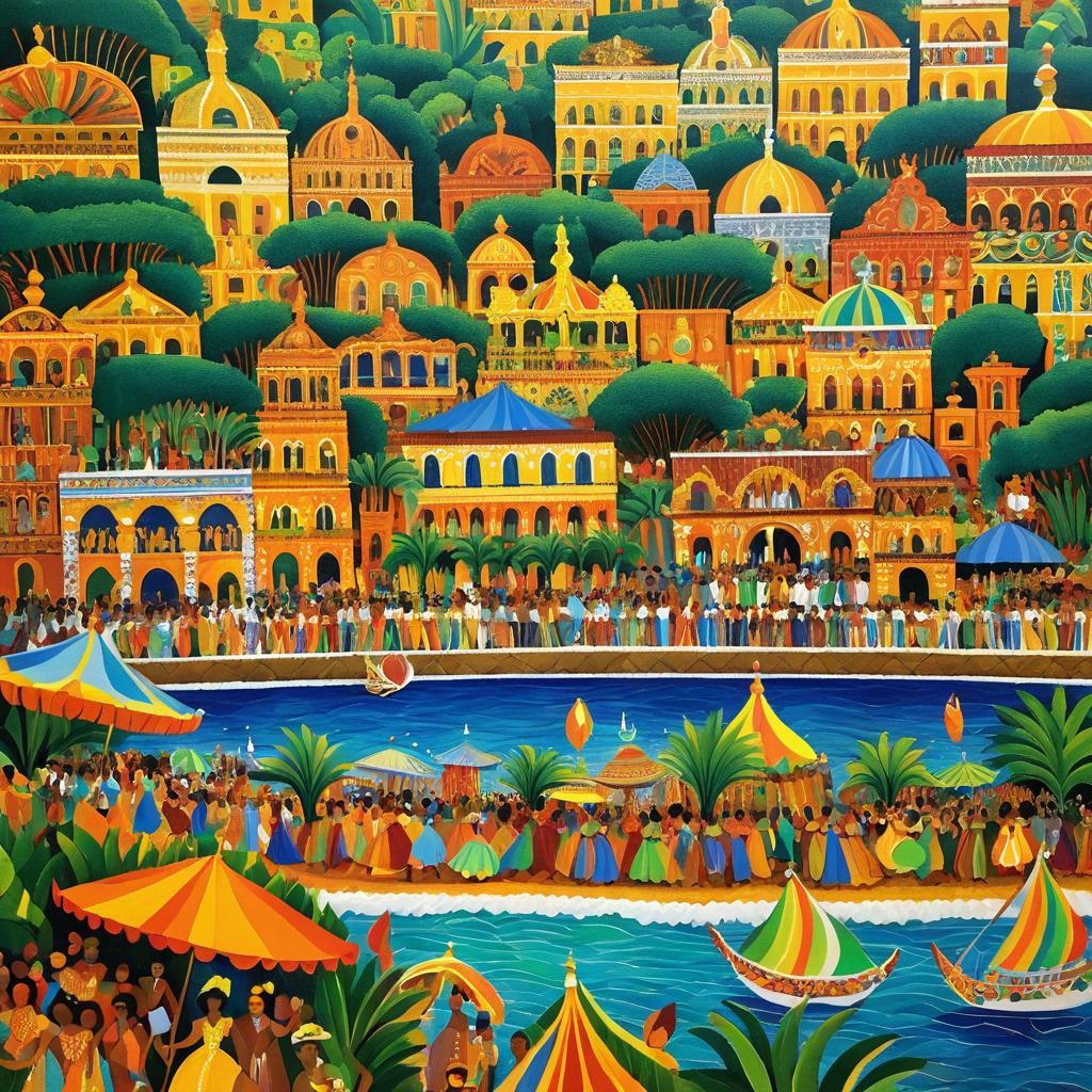 A vibrant and detailed painting depicting Rio de Janeiro during Carnival, featuring colorful crowds, ornate historical buildings with domes, lush greenery, and boats on water, all rendered in the distinctive style of Diego Rivera with intricate and ornate elements.