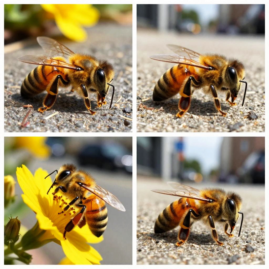 This is a photo collage featuring four close-up shots of a honeybee in different urban settings. The top left and bottom left shots show the bee standing on a gray pavement near yellow flowers, while the top right and bottom right shots show it walking on a sidewalk and near a building, respectively. The background includes blurred city elements like cars, buildings, and street signs, with bright sunlight highlighting the bee's yellow and black striped body and translucent wings.