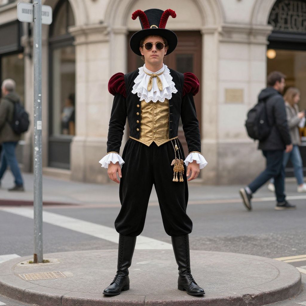 Photograph of a man in an elaborate black Victorian-style outfit with gold vest, white ruffled collar, red feathered hat, standing on an urban