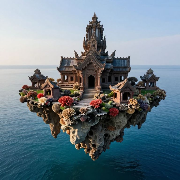The sunlit ruins of an ancient temple rise from the depths of a tranquil sea, where coral clusters pulse with life, defying gravity as they float like ethereal islands in a world where land and water merge in surreal harmony.