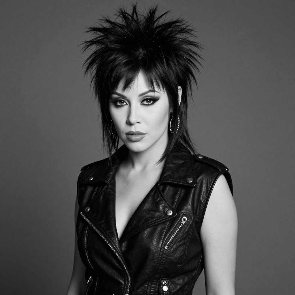 A striking black and white portrait of a woman styled in a classic Joan Jett-inspired look, featuring a sleeveless black leather jacket and a spiky, edgy hairstyle. The cinematic realism and moody lighting enhance the bold rock-and-roll attitude evoked in this image.