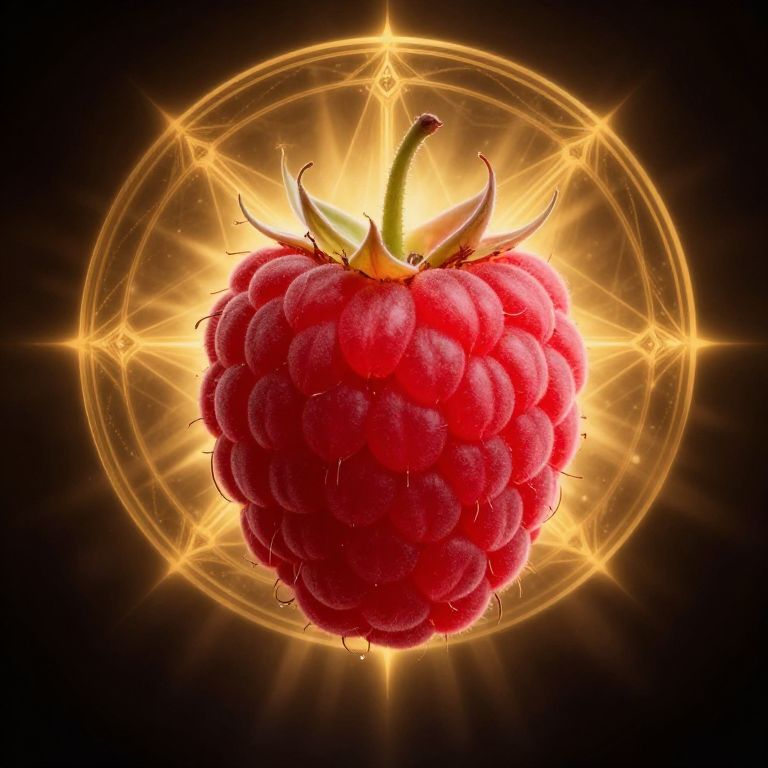 Raspberry an eldritch angle with radient golden light has a halo of sacred geometry around its head,