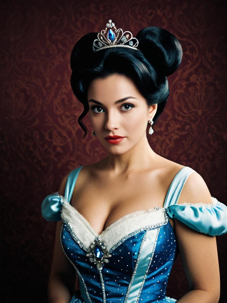 Woman in Disney Princess Dress, photorealistic glamour portrait, detailed tones