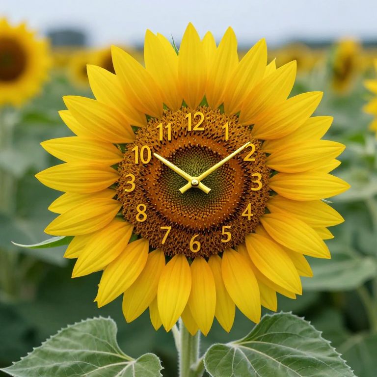A whimsical sunflower clock emerges from a bed of verdant leaves, its golden petals seamlessly intertwining with the mechanical hands of time, creating a surreal fusion of nature and artifice.