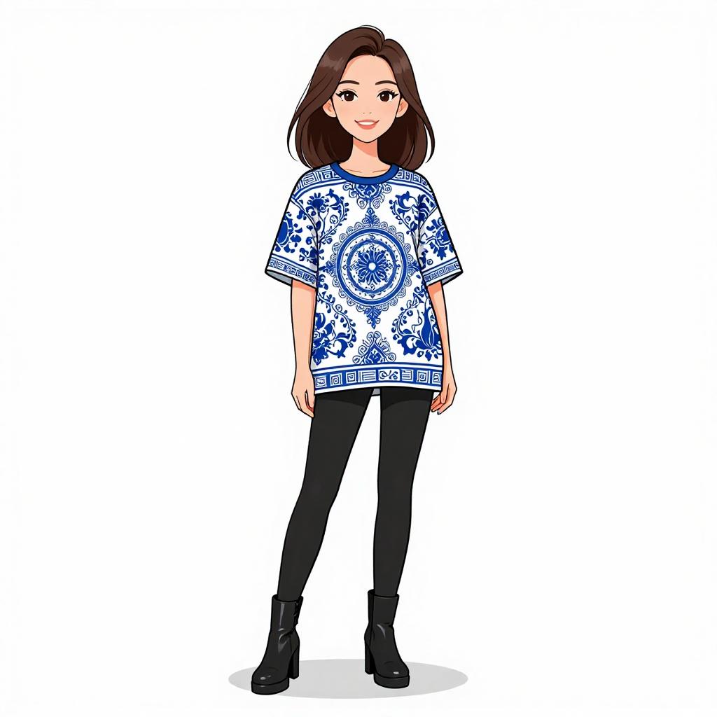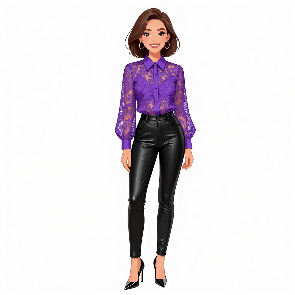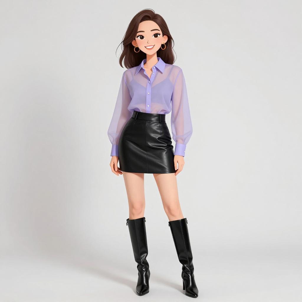 Woman with pretty face and pretty hair. smiling Woman, contemporary chic, royal blue silk blouse with gathered waist and peplum detail, long sheer sleeves, round neckline, slim-fitting black pants, over-the-knee suede boots with block heels, holding a small black leather clutch, plain white studio background. --sref 1467