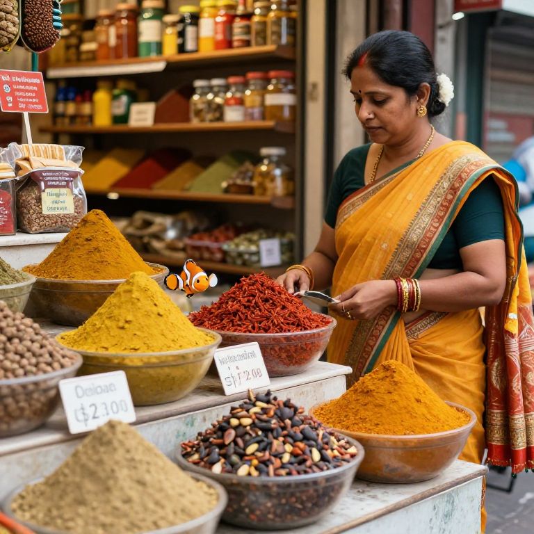Finding Nemo indian spice market Khari Baoli showing various spices in bowls on a countertop and an indian lady dressed in a sari standing nearby,