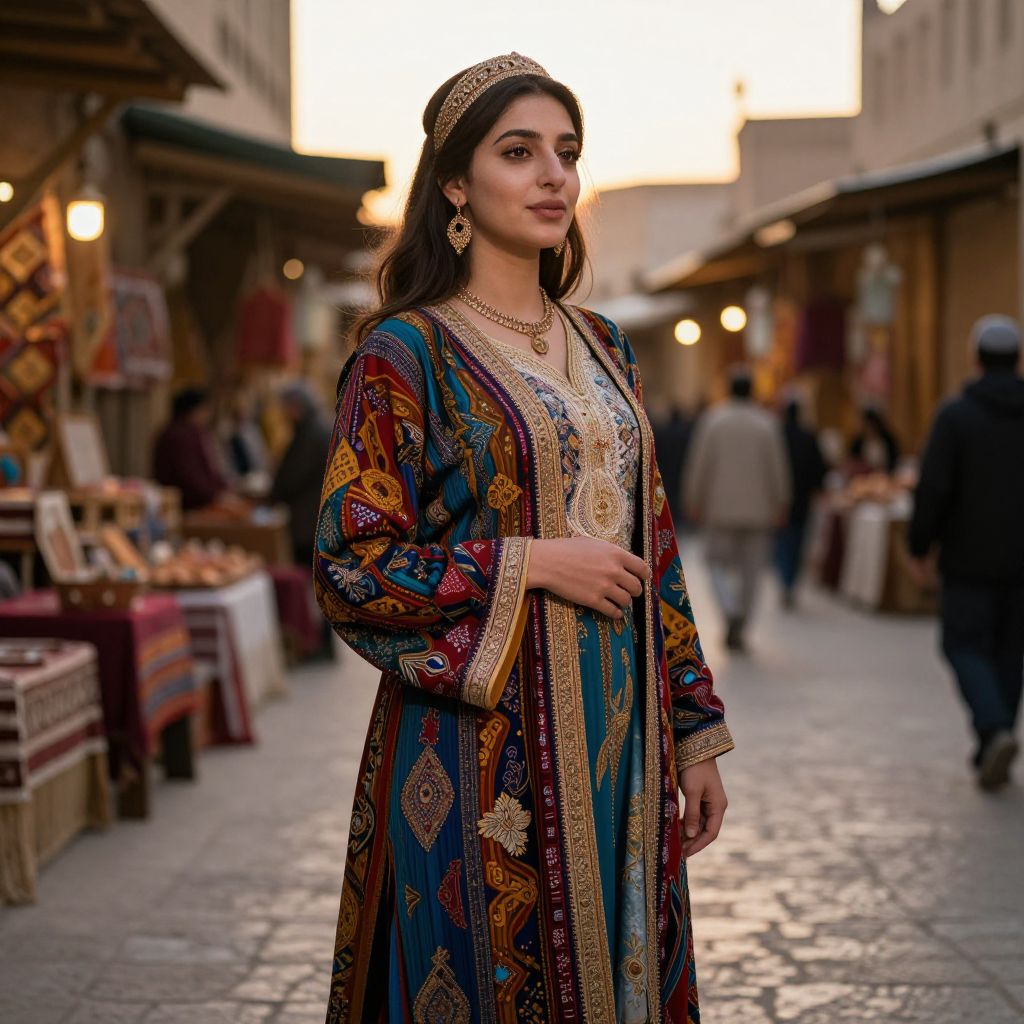 Arab girl with flowing black hair wearing a decorative hijab sitting on a balcony overlooking a bustling souk, colorful market stalls, rich textures, warm afternoon light, authentic Middle Eastern setting, high detail, DALL·E style.