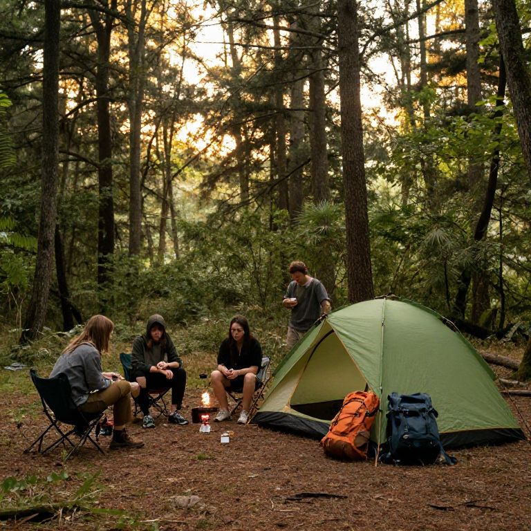 A group of friends setting up a tent in a forest clearing, with a camping stove and backpacks nearby, as golden hour light filters through the trees