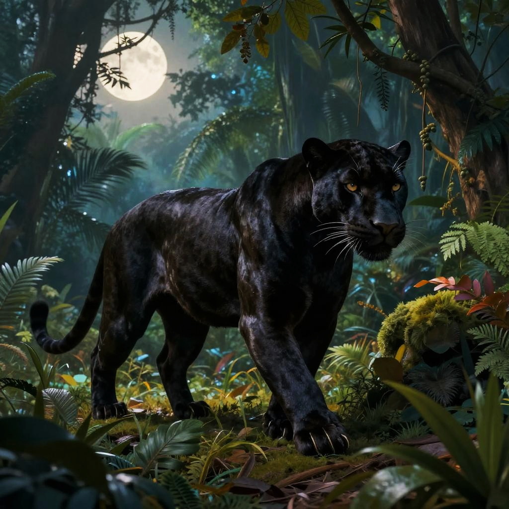 Digital artwork of a dark, muscular black panther with glowing yellow eyes, standing alert in a dense, moonlit jungle filled with ferns and colorful