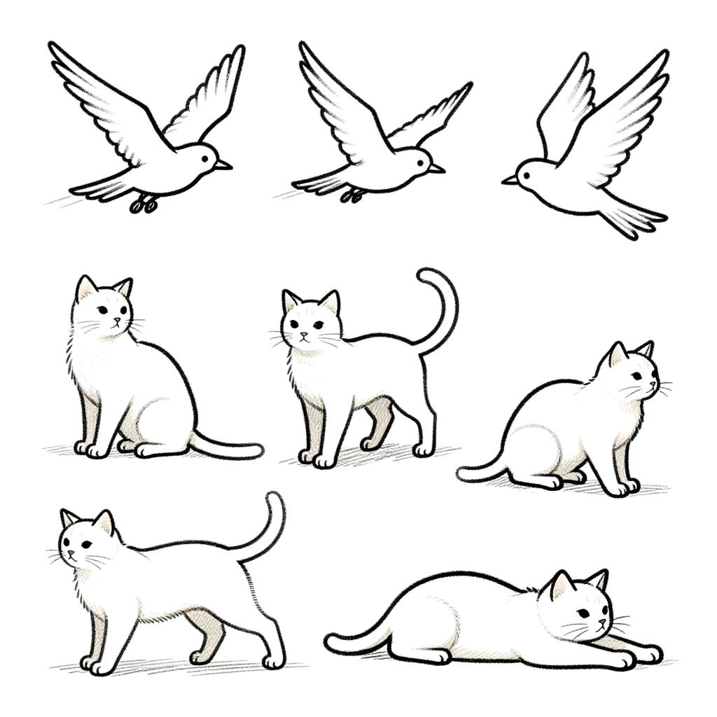 Images for sketching portraying animals in motion, such as birds in flight and cats stretching, with simplified outlines and dynamic poses to practice form and anatomy, minimal background distractions, high contrast black and white style.
