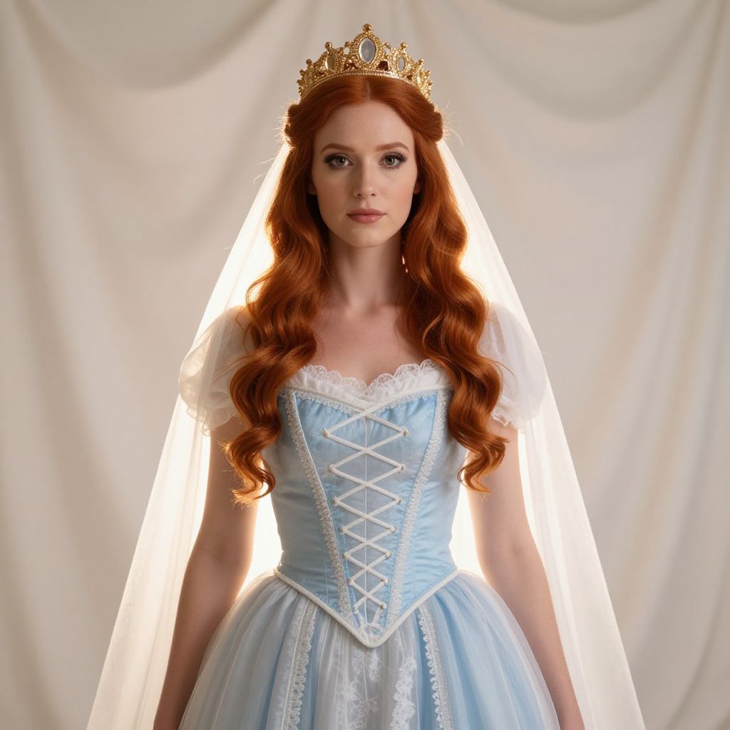 Photograph of a fair-skinned woman with long, wavy, red hair wearing a golden crown and a light blue, white-laced princess dress with a flowing white veil. She stands against a softly lit, white fabric backdrop, giving a fairy tale, ethereal vibe. Her expression is calm and slightly serious, with a subtle smile. The light creates a warm, glowing effect around her hair and dress.