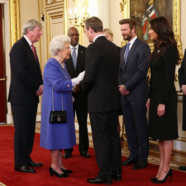 Queen Elizabeth II warmly greets guests, including Sir John Major, Sir Lenny Henry, David Beckham, and Nicola Adams, during a formal reception held in a grand hallway adorned with ornate gold-framed walls and a red carpet, marking her second joint engagement with Meghan Markle in as many weeks.