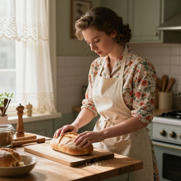 Tradewife in a cozy 1950s kitchen, wearing a vintage floral dress and apron, preparing homemade bread with natural light streaming through lace curtains, warm tones, nostalgic and peaceful atmosphere, detailed textures of wood and fabric.