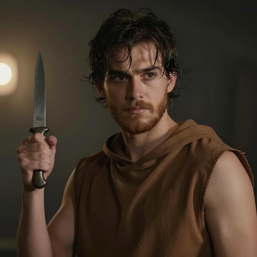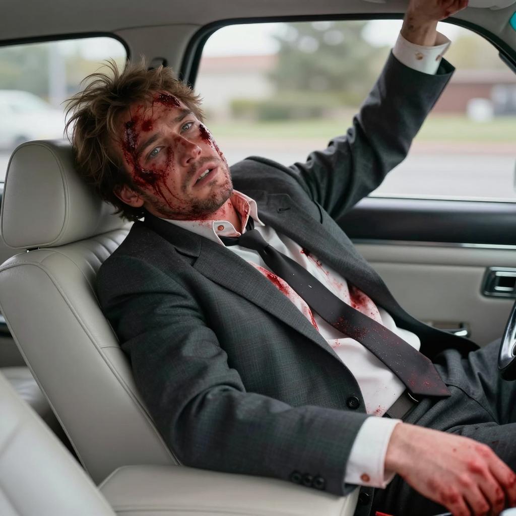 Close-up photograph of a bloodied man with dirty brown hair, a thick braided rope tied around his neck, and a gory red slash across his cheek and neck. He has a pained expression, eyes partially closed, against a blue sky background.