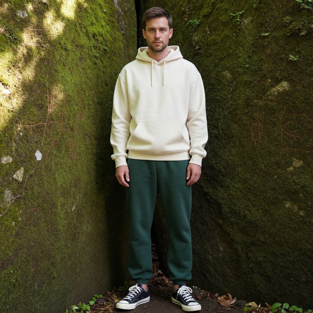 Photograph of a young Caucasian man with short brown hair and a trimmed beard, standing against a moss-covered wall. He wears a cream-colored hooded sweatshirt, dark green pants, and black and white sneakers. His hands hang loosely by his sides. The mossy wall has patches of sunlight and shadow, with a small plant growing at the bottom. The ground is covered in leaves and dirt, adding a natural, outdoor feel to the scene. The man's expression is neutral, and the overall atmosphere is calm and slightly mysterious.