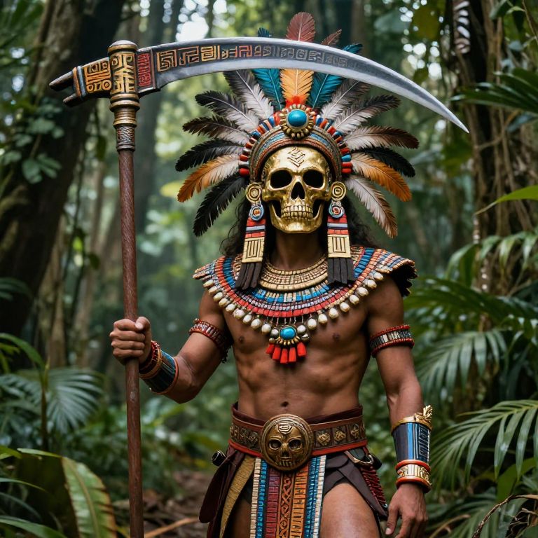 Aztec reaper standing solemnly in a dense ancient jungle, adorned in intricate golden skull mask and traditional feathered headdress, holding a scythe carved with mysterious glyphs, vibrant colors, cinematic lighting, highly detailed fantasy artwork