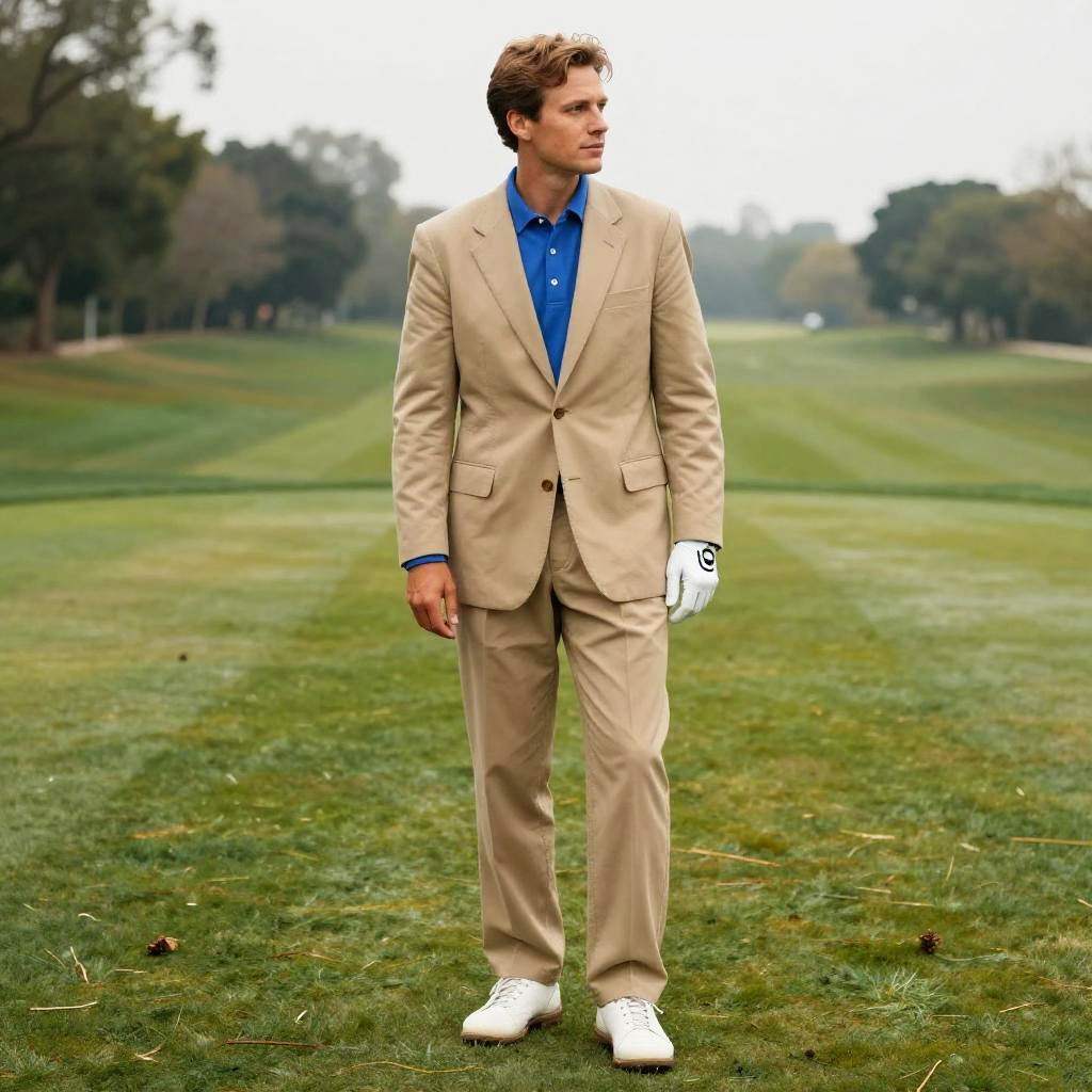 Vintage Golf Clothes, man in a tan suit and blue shirt standing on a golf course