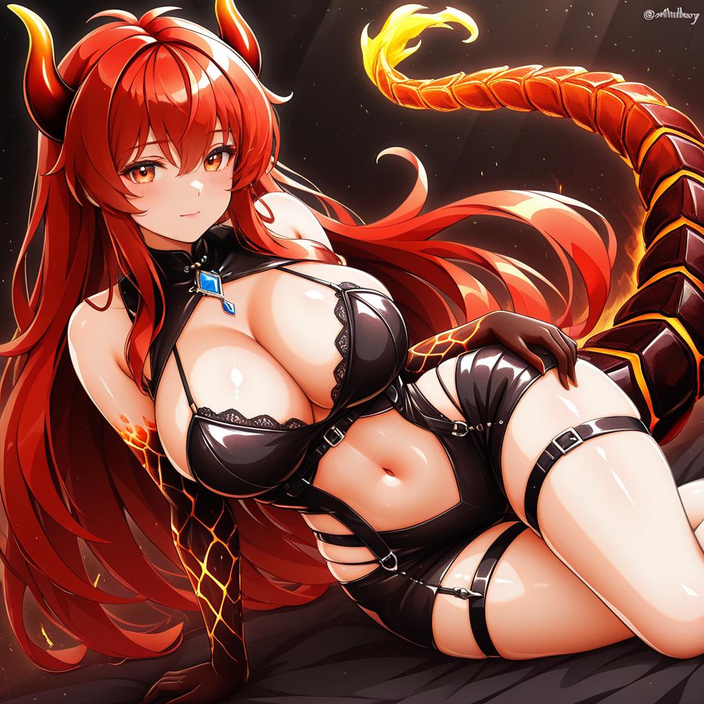 Dola (nijisanji), nijisanji, 1girl, dragon horns, dragon tail, red eyes, hair between eyes, red hair, long hair, very long hair, large breasts, huge breasts, cleavage, navel, virtual youtuber, virtual youtuber, dragon girl, by artist arthur ko, dark_illustrious