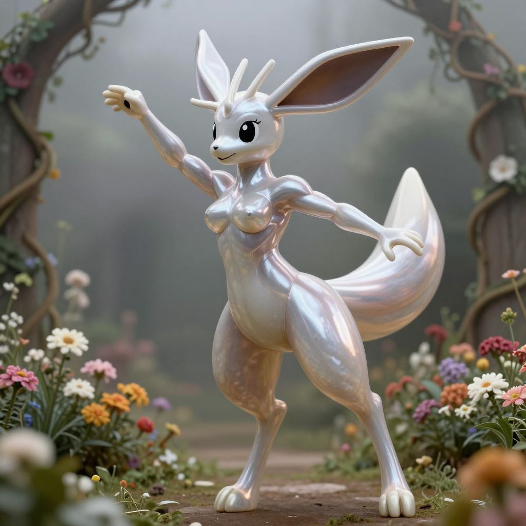 A CGI image depicts a shiny, white, anthropomorphic fox-like creature with large, pointed ears and a bushy tail. The creature stands on two legs, raising one arm and smiling with large, black eyes. Its body is sleek and reflective, with visible muscle definition. The background is a blurred, fairy-tale-like garden with colorful flowers and twisted vines framing an archway. The creature's stance is confident and playful, set against a soft, misty, green forest backdrop. The overall style is whimsical and fantastical, with a focus on vibrant colors and detailed textures.