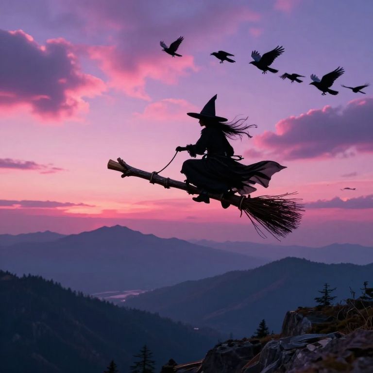 Silhouetted witch on broomstick flying above mountains at sunset, with birds in flight, against a pink and purple sky. Photographic fantasy