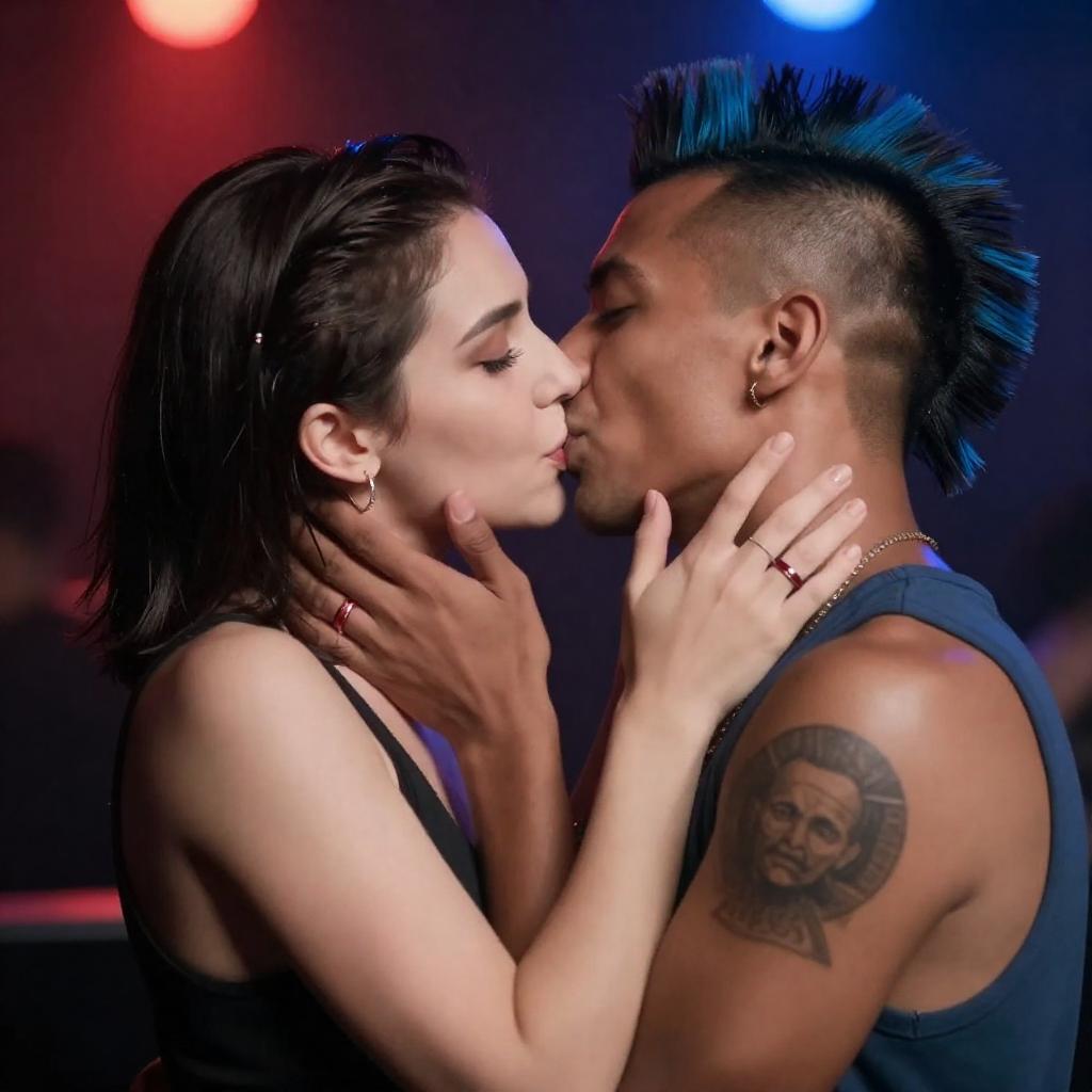 Photograph of two people kissing passionately. The woman on the left has slicked-back dark hair, a black sleeveless top, and red ring on her left hand. The man on the right has a mohawk with blue highlights, a tattoo on his right shoulder, and a blue strap over his shoulder. Both are holding each other's faces. Background has red and blue bokeh lights.