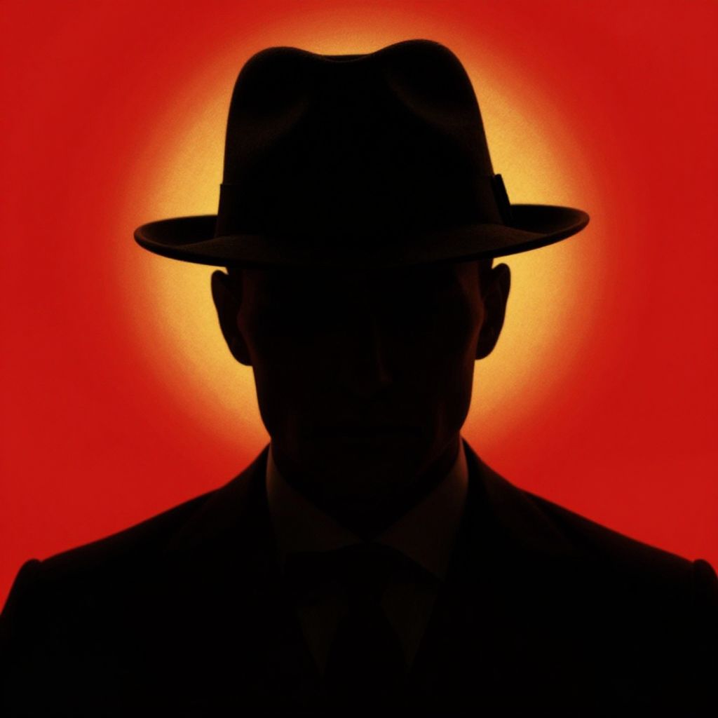 A striking silhouette of a man wearing a fedora hat, set against a vibrant red background with a golden halo-like glow, evokes a vintage noir aesthetic reminiscent of the Peaky Blinders series, rendered in a bold, graphic design style.