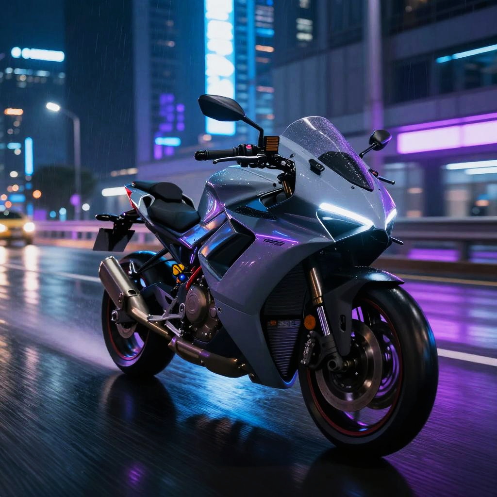 Cobriso, a futuristic sleek motorcycle speeding through a neon-lit city highway at night, reflective rain-soaked streets, vibrant blues and purples dominating the color scheme, motion blur conveying speed and energy, cyberpunk aesthetic with detailed vehicle design.