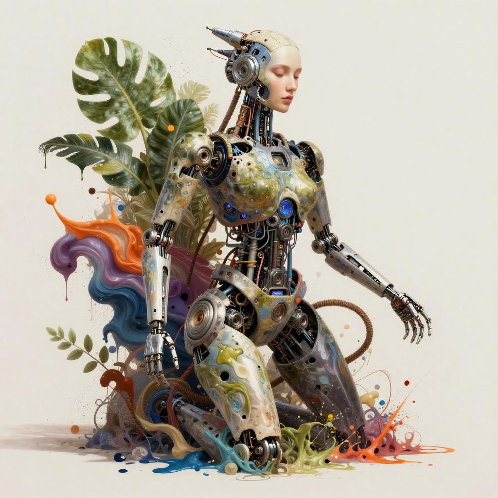 Digital art of a kneeling, humanoid robot with metallic parts, colorful paint splatters, and leafy elements blending into organic shapes.