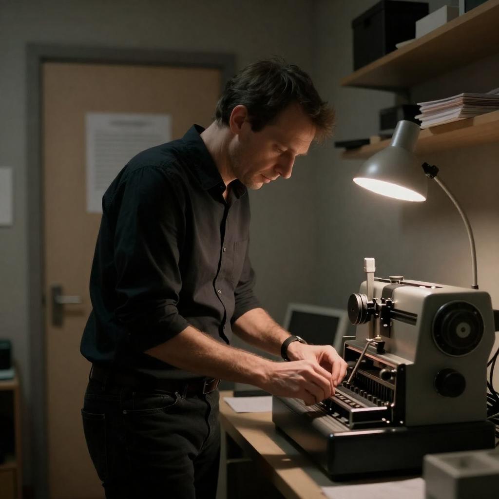 Middle-aged man with glasses, short brown hair, grey shirt, and bandaged right hand, intently examining a black lamp on a desk. Dimly lit office background with yellow lamp and dark furniture. Man's face shows concentration. Single person.