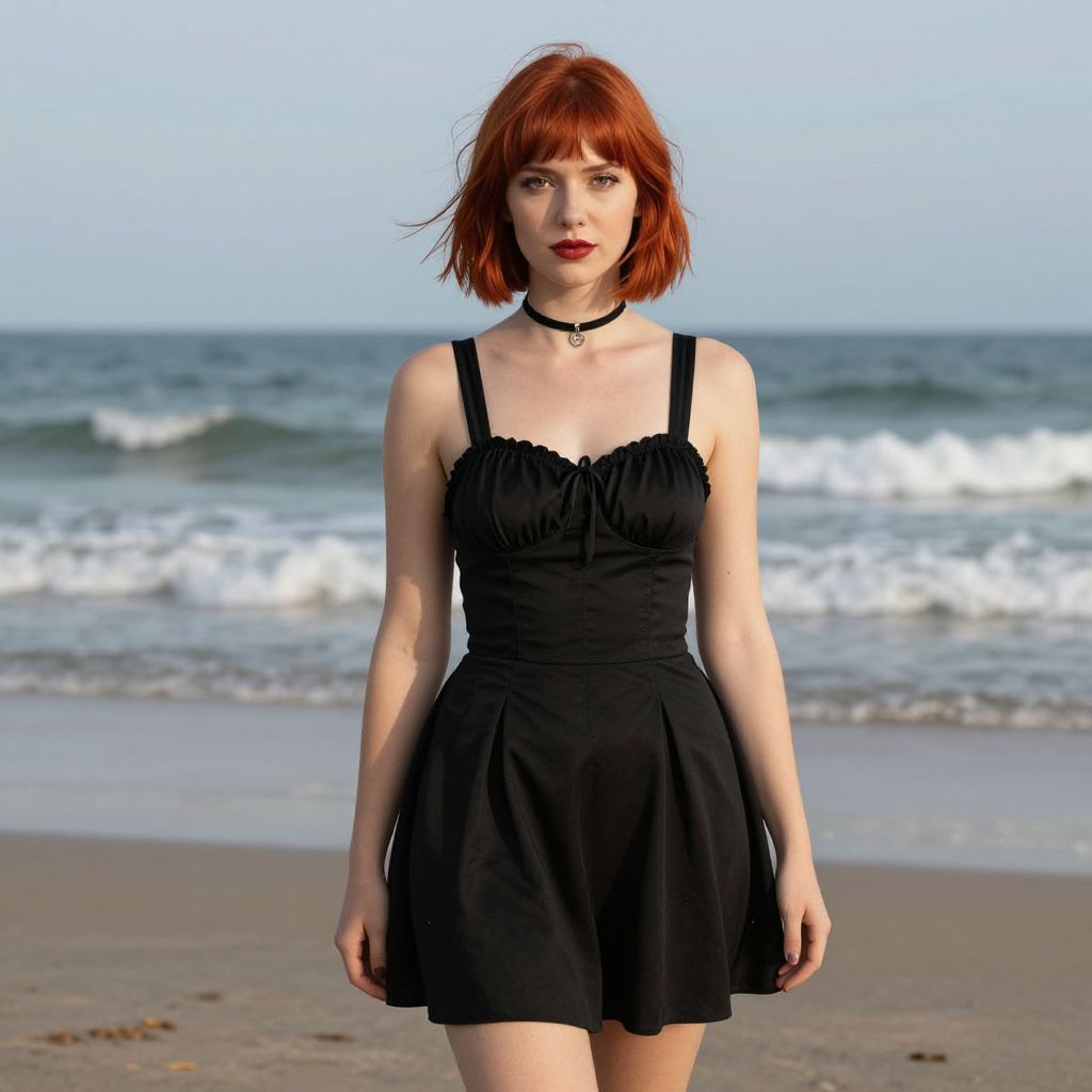 Photograph of a pale-skinned woman with short, straight red hair standing on a beach. She wears a black, sleeveless, strapless dress with a fitted bodice and a flared skirt, a black choker necklace, and dark red lipstick. The background shows a calm ocean with small waves and a clear, blue sky. The beach sand is visible in the foreground. The woman's expression is neutral, and she stands directly facing the camera. The image has a slightly enhanced, digital photographic style.