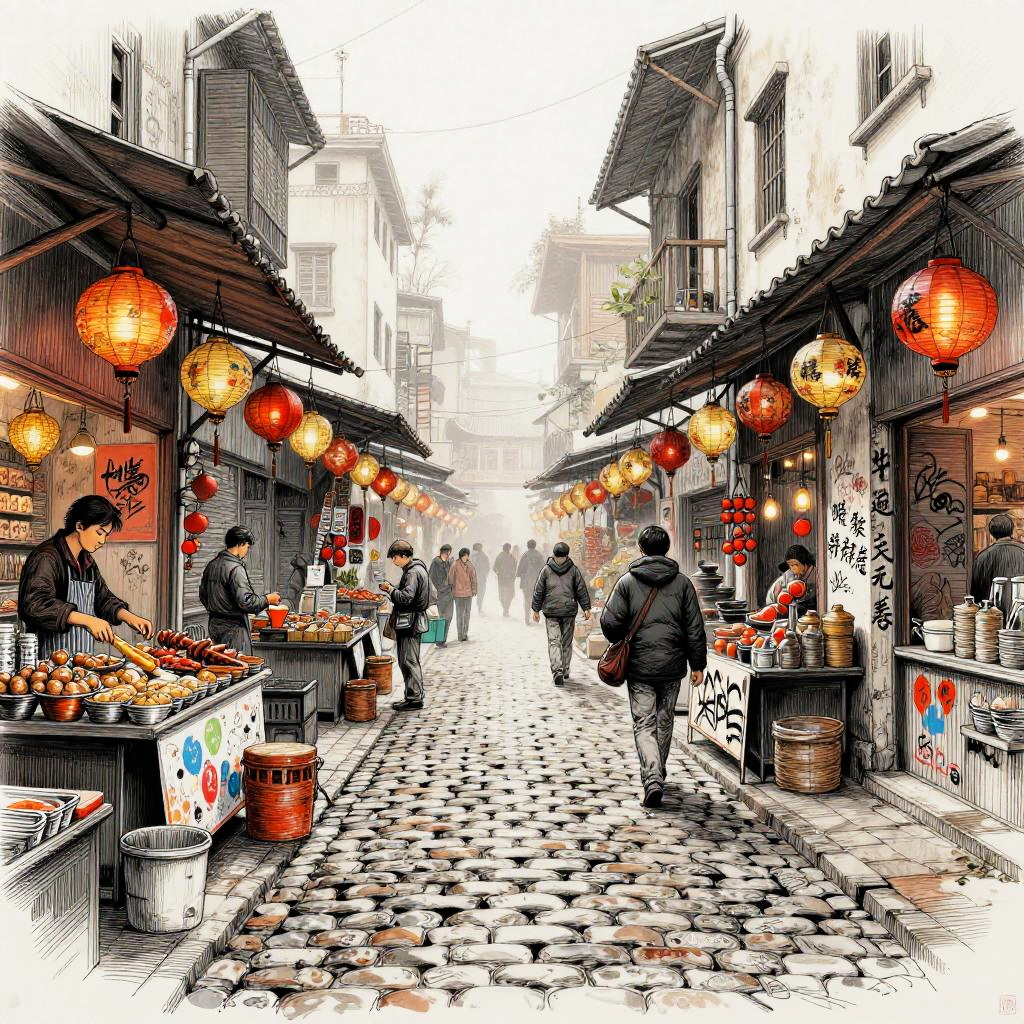 Alleyway background drawing of a bustling market alley filled with hanging lanterns, vibrant stalls, textured cobblestones, graffiti walls, and subtle morning fog, rendered in a detailed pen and ink style blending realism with artistic line work to create an immersive cityscape.