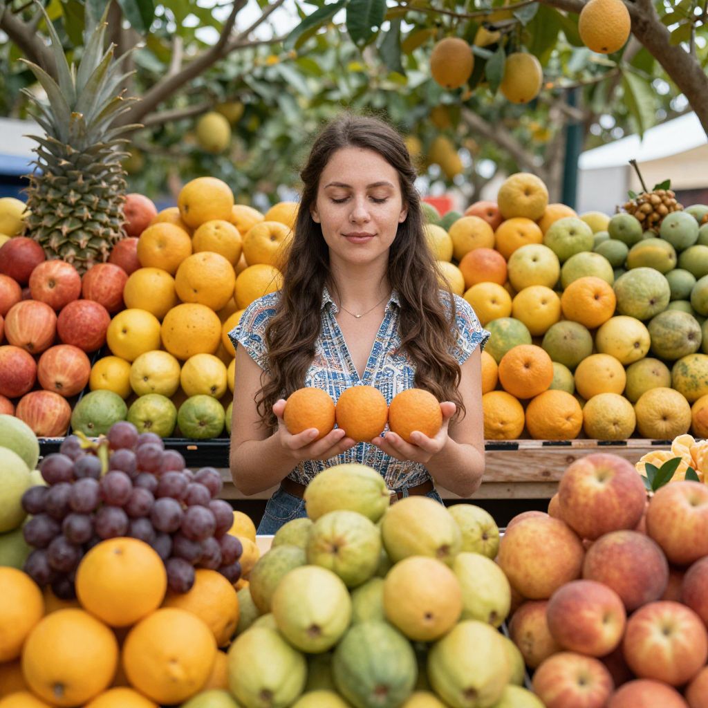 Amidst the vibrant hues of freshly harvested fruits, a woman radiates a sense of serenity and abundance, embodying the timeless connection between nature’s bounty and human joy.