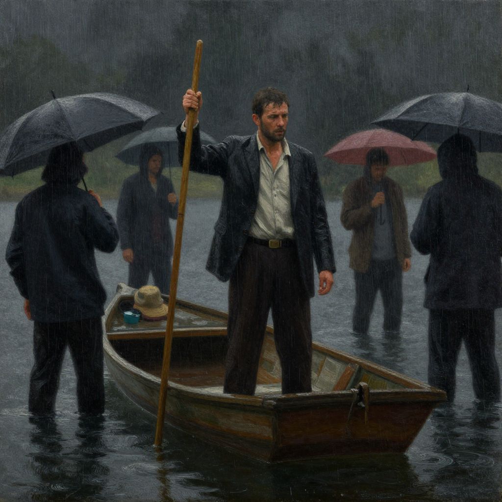 A man stands in a small boat holding a long stick, surrounded by others in the rain, depicted in a dark, moody, and realistic oil painting style.