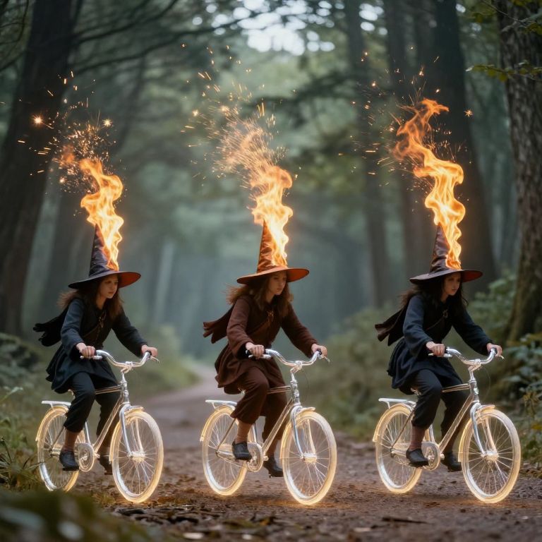 Three wizards in pointed hats ride transparent bicycles at varying altitudes, casting golden sparks and flames that defy gravity against a serene forest backdrop.